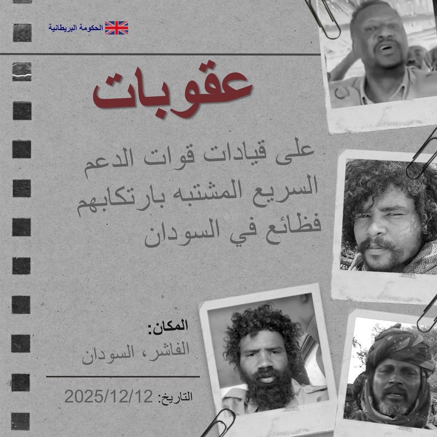 إيلاف من لندن: المملكة المتحدة، إلى جانب فرنسا والولايات المتحدة، استطاعت تأمين فرض عقوبات ضد 4 من قيادات قوات الدعم السريع بموجب نظام الأمم المتحدة للعقوبات المرتبطة بالسودان.